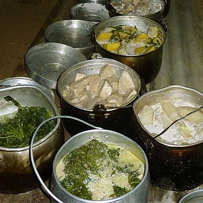 Men vindt tegenwoordig makreel in tomatensaus een lekkernij die door de maaltijd wordt verwerkt, soms door de groente of door een ander gerecht. Deze blikjes konden we zelfs in de Lamogaistam in de "winkel" (een hutje) kopen. En als je opeens een hoop gekakel hoort en daarna is het stil... dan is er weer een andere specialiteit van de lokale kok!
