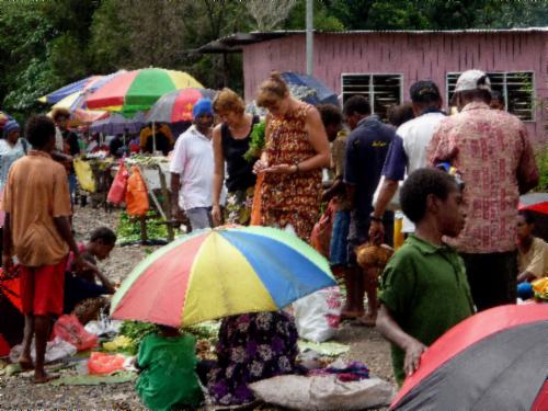 De weg naar Kimbe... Roelie en Annette op een markt langs de weg!